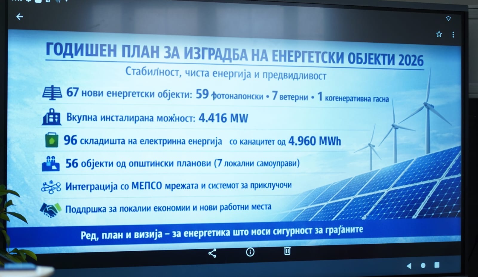 Дополнително, во Годишниот план се вклучени и 56 енергетски објекти од општинските енергетски планови доставени од 7 единици на локалната самоуправа – Македонски Брод, Лозово, Дебрца, Кавадарци, Куманово, Брвеница и Кочани. Станува збор за фотонапонски електроцентрали со вкупна инсталирана моќност од 51,8795 MW, како и 61 складиште на електрична енергија со вкупна моќност од 27,6792 MW и капацитет од 117,56 MWh, што ја нагласува улогата на локалните самоуправи во енергетската транзиција.