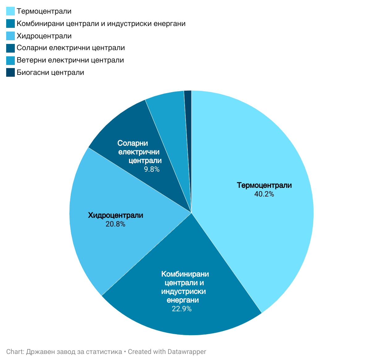 Во структурата на производството на електрична енергија, термоцентралите произведоа 153.281 МWh, комбинираните и индустриските централи 87.399 МWh, хидроцентралите 79.362 МWh, соларните централи 37.373 МWh, ветерните централи 19.905 МWh, а биогасните централи 3.982 МWh.