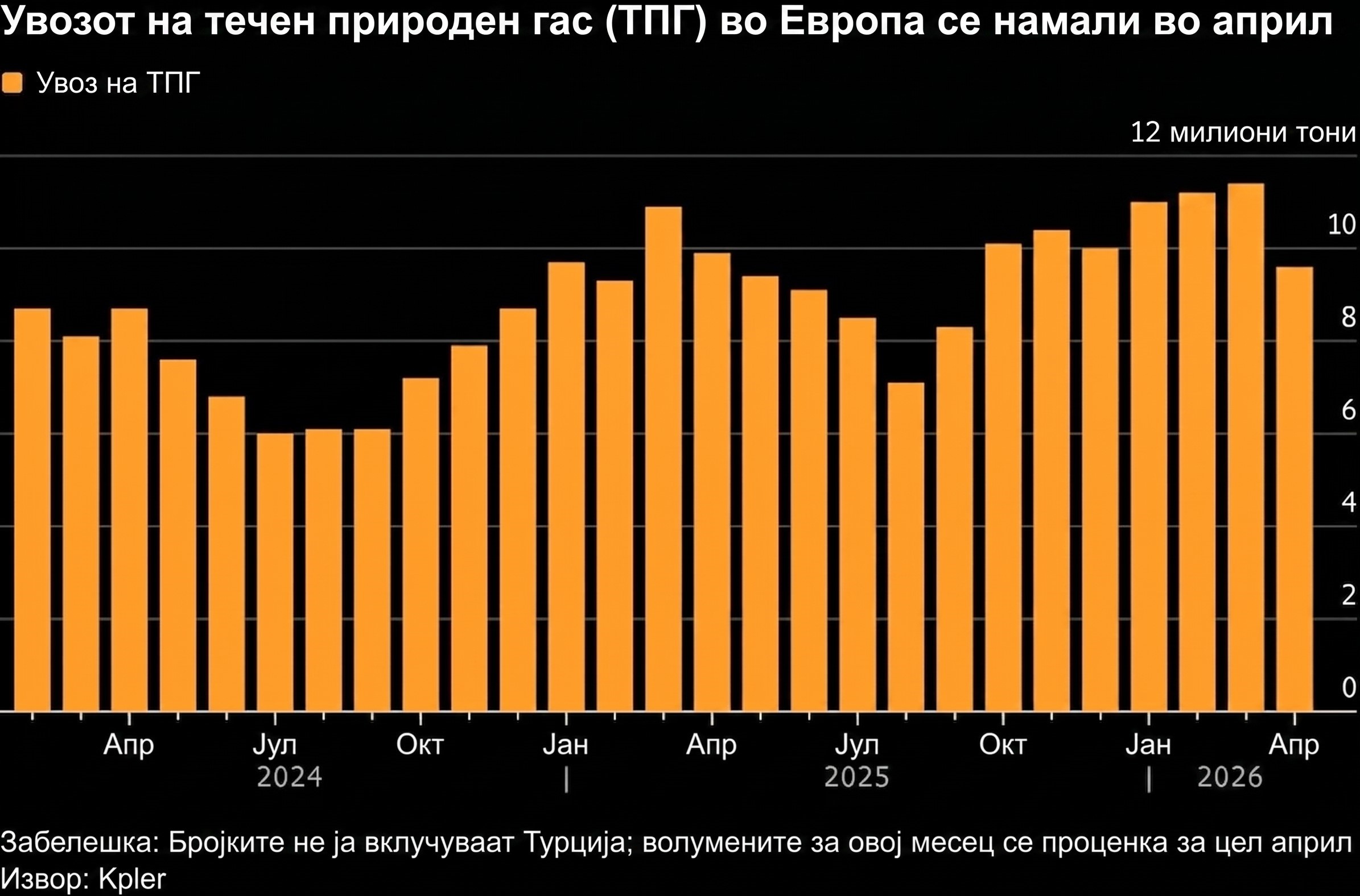 Според анализите на компанијата Kpler, количините на ЛНГ што пристигнале во Европа во април се помали во споредба со истиот период лани, а проценките се дека вкупниот месечен увоз ќе биде за околу 3% понизок. Ова би бил прв годишен пад на месечно ниво од почетокот на 2025 година.