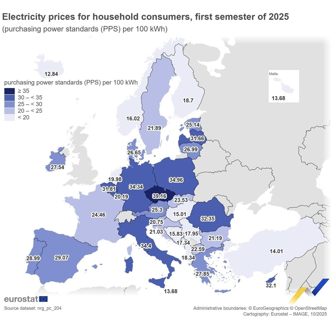 Изразено во стандард на куповна моќ (PPS), највисоки реални цени плаќале домаќинствата во Чешка (39,16), Полска (34,96) и Италија (34,40), а најниски во Малта (13,68), Унгарија (15,01) и Финска (18,70).
