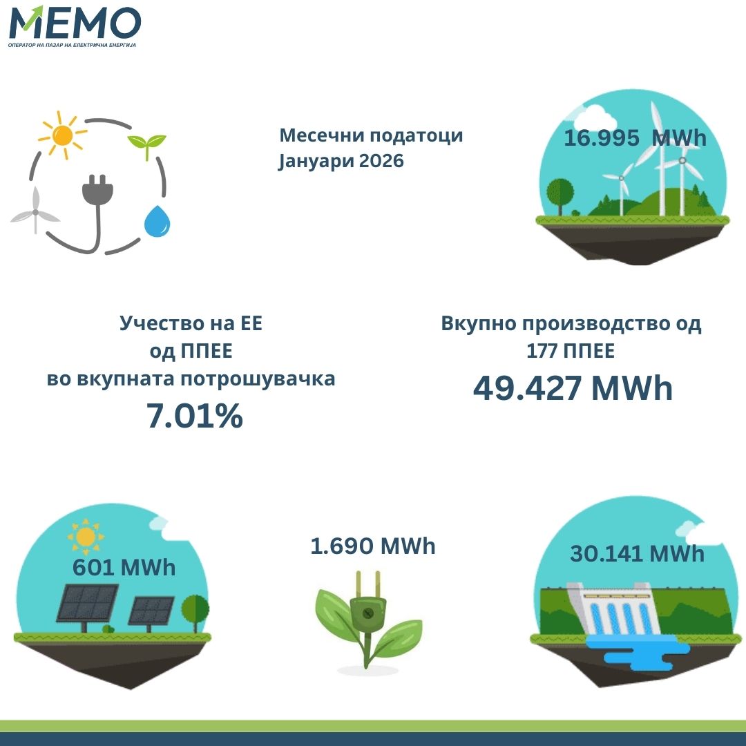 Скопје. 6 февруари 2026 – Во јануари 2026 година, согласно податоците на Националниот оператор на пазар на електрична енергија – МЕМО, од вкупно 177 повластени производители на електрична енергија од обновливи извори во земјава произведени се 49.427 MWh електрична енергија.