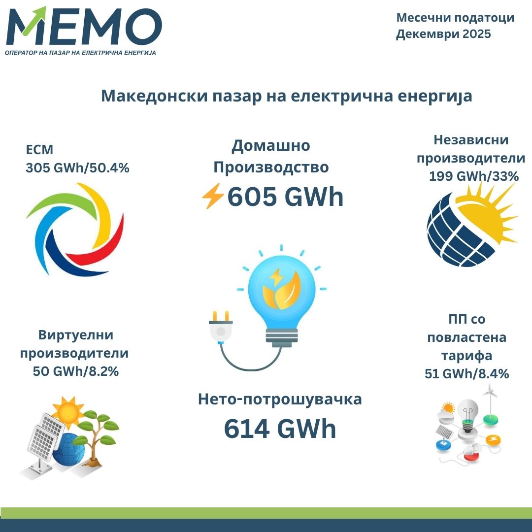 Скопје. 20 јануари 2026 – Во декември 2025 година, согласно податоците на Националниот оператор на пазар на електрична енергија – МЕМО, за задоволување на вкупната нето-потрошувачка на електрична енергија во државата продадени се 614 GWh, што претставува значително зголемување во однос на ноември, кога нето-потрошувачката изнесуваше 504 GWh.