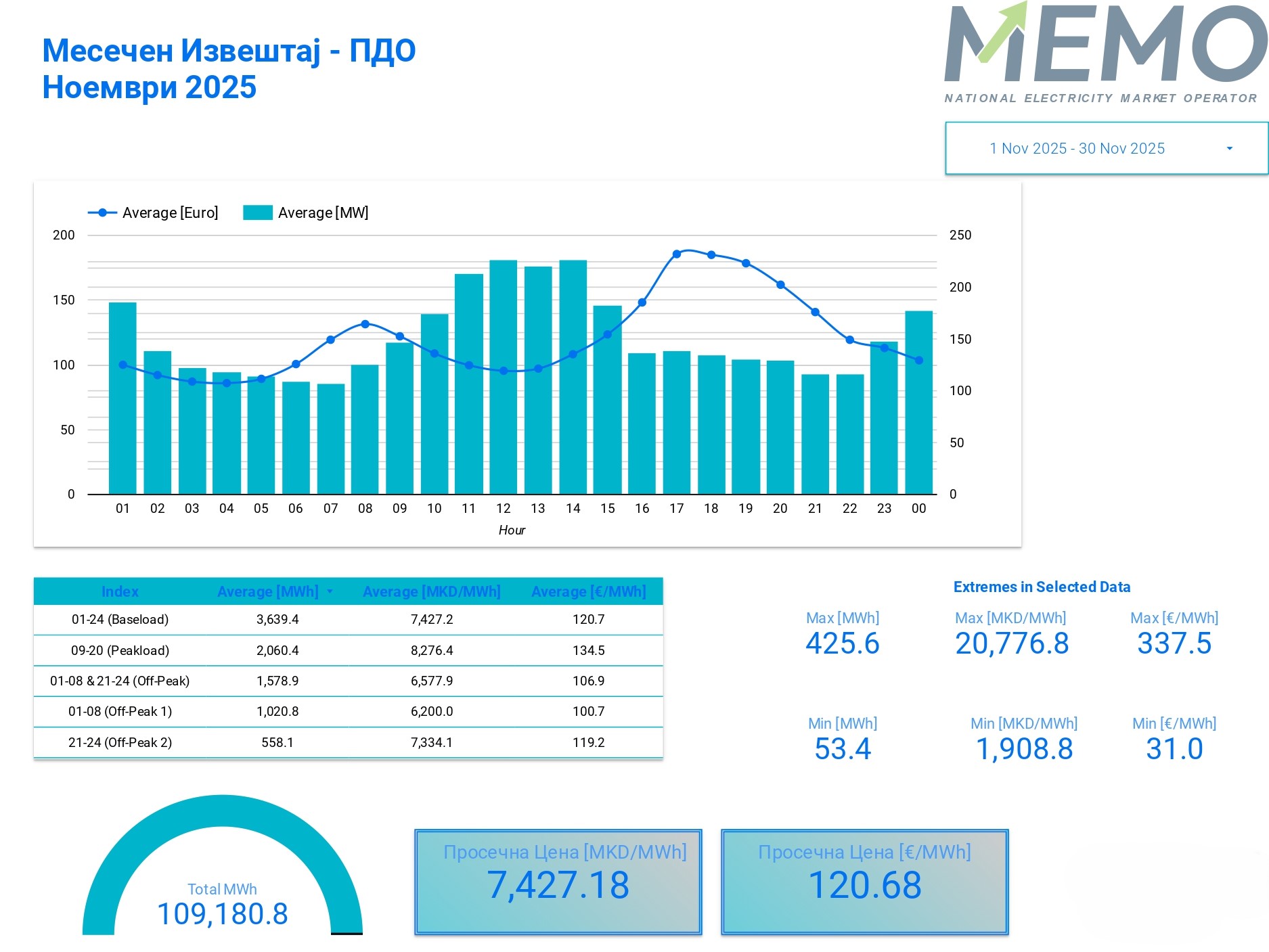 Скопје. 10 декември 2025 – Во ноември 2025 година на Македонската берза за електрична енергија истргувани се вкупно 109.180,8 MWh, покажуваат најновите податоци на Националниот оператор на пазар на електрична енергија – МЕМО ДООЕЛ Скопје. Просечната берзанска цена изнесувала 7.427,18 денари, односно 120,68 евра за MWh.