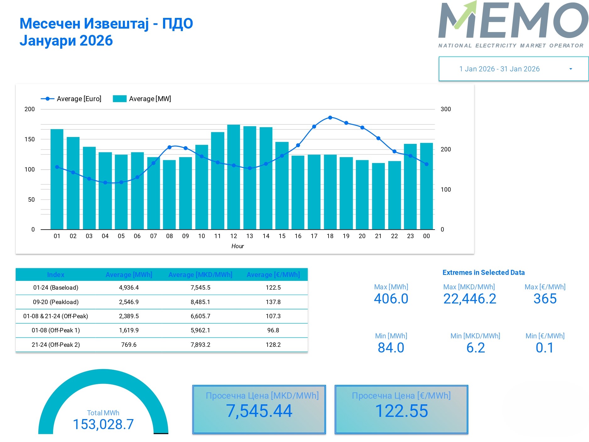 Скопје. 5 февруари 2026 – Во јануари 2026 година, согласно податоците на Националниот оператор на пазар на електрична енергија – МЕМО ДООЕЛ Скопје, на пазарот за тргување со електрична енергија ден однапред беа истргувани вкупно 153.028,7 MWh, по просечна цена од 7.545,44 денари, односно 122,55 евра за MWh.