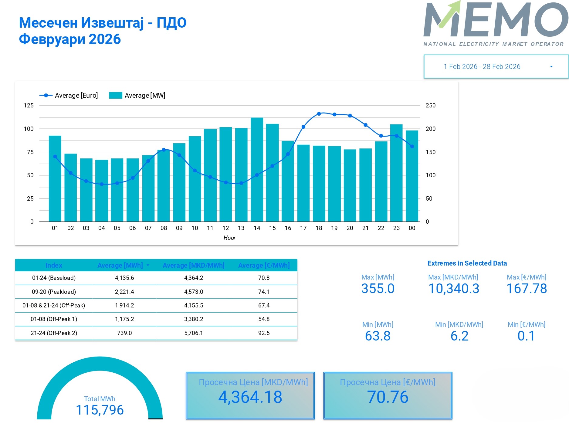 Во февруари 2026 година, согласно податоците на Националниот оператор на пазар на електрична енергија – МЕМО ДООЕЛ Скопје, на пазарот за тргување со електрична енергија ден однапред беа истргувани вкупно 115.796 MWh, по просечна цена од 4.364,18 денари, односно 70,76 евра за MWh.