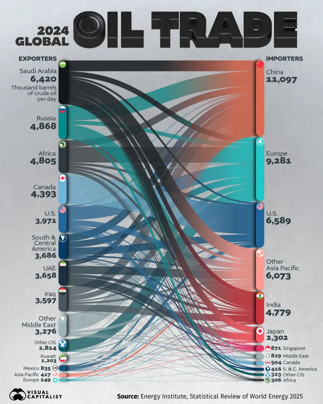 Од страна на снабдувачите, во 2024 година Саудиска Арабија останува глобален лидер со 6,42 милиони барели дневно, пред Русија (4,87 милиони), Африка (4,81 милиони) и Канада (4,39 милиони). Со значаен извоз настапуваат и САД (3,97 милиони), Јужна и Централна Америка (3,67 милиони), Обединетите Арапски Емирати (3,66 милиони) и Ирак (3,60 милиони).