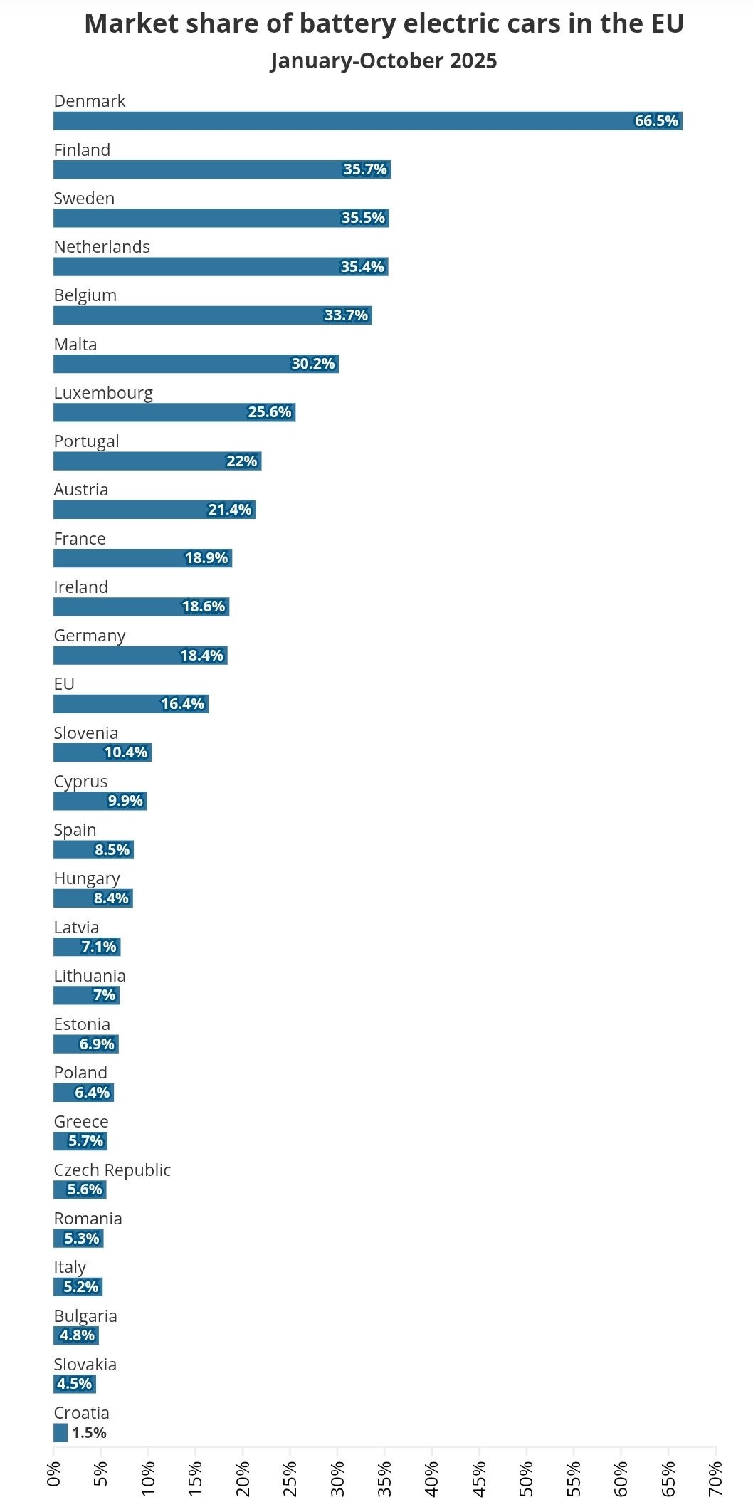 Од јануари до октомври годинава во ЕУ биле регистрирани 1.473.447 нови електрични автомобили, што е за над 301.000 повеќе од минатата година. Германија убедливо води со над 434.600 нови регистрации и раст од 39,4% на годишно ниво.
