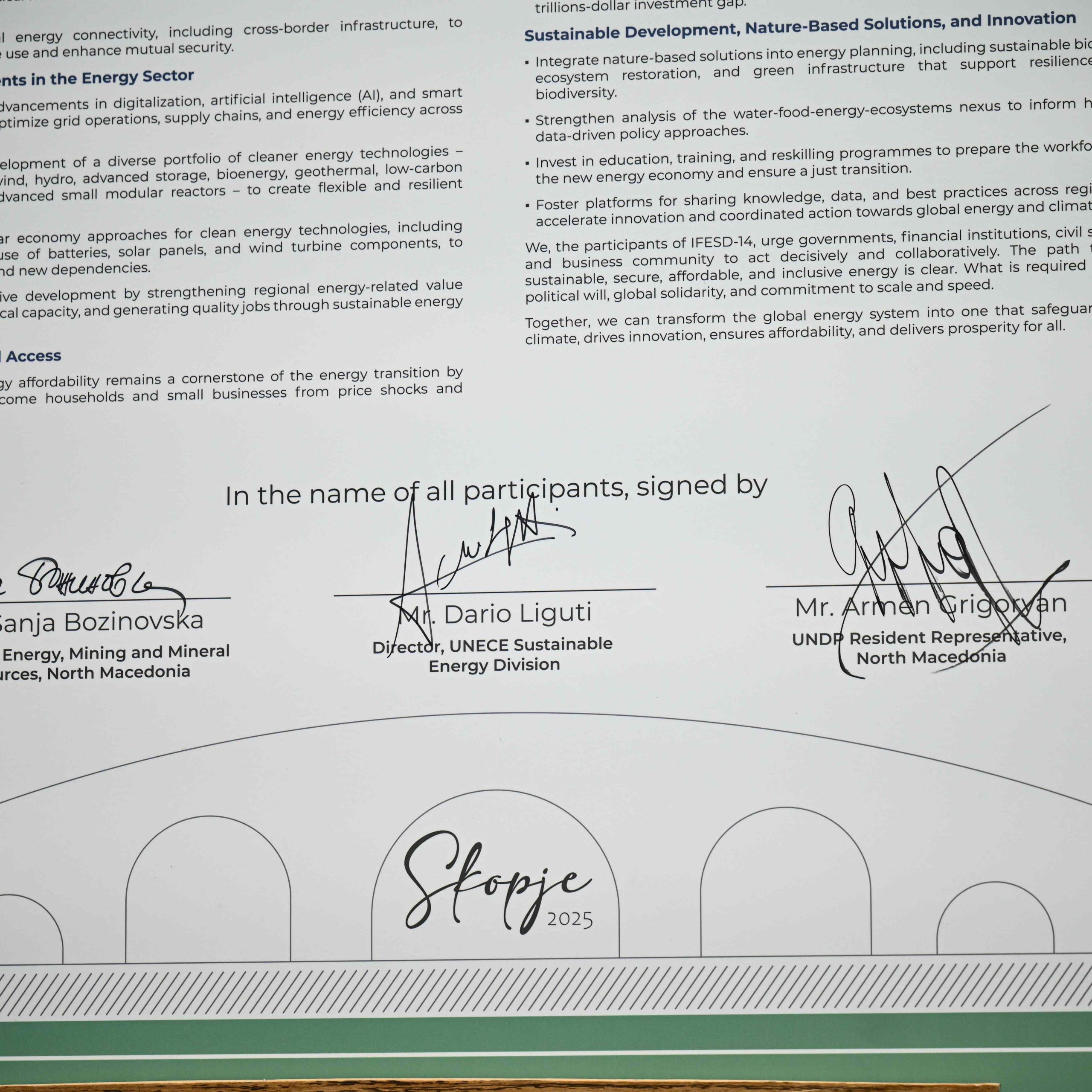 Скопје. 30 октомври 2025 – Со потпишување на „Декларацијата Скопје“ заврши 14. Светски форум за одржлива енергија (IFESD-14), што во изминатите три дена го претвори Скопје во глобален центар на енергетскиот дијалог, идеи и визии за иднината. Претставниците на Обединетите нации и петте регионални економски комисии ја оценија организацијата како „беспрекорна“, а Македонија и Скопје како „вистински домаќини на светската енергетска сцена“.